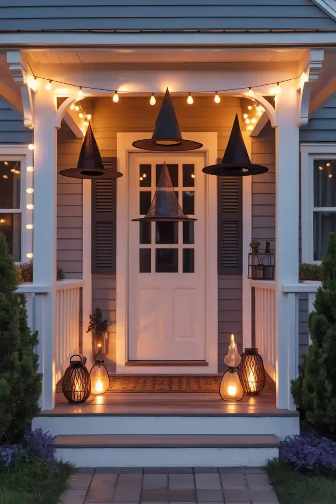 Nothing says “witch vibes” like floating hats greeting your guests. Use fishing line or clear string to hang lightweight witch hats from your porch ceiling. This creates a magical hovering effect, especially when paired with twinkling string lights.