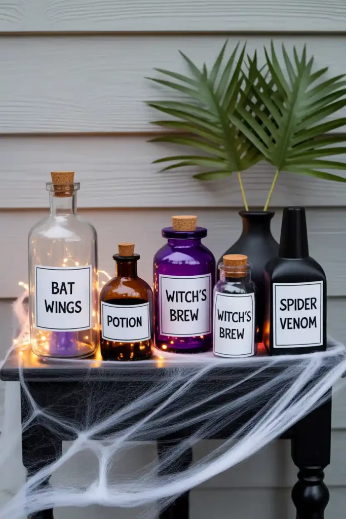 Transform a side table or shelf into a “Potion Bar.” Use glass bottles, jars, or thrifted vases to create potion bottles labeled with fun names like “Bat Wings,” “Witch’s Brew,” or “Spider Venom.”
