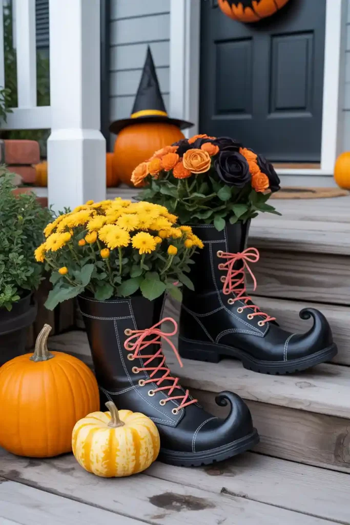 For a mix of cute and spooky, repurpose old boots or witch shoe props as planters. Fill them with mums, mini pumpkins, or faux black roses. Place them at your entry steps or beside your front door.