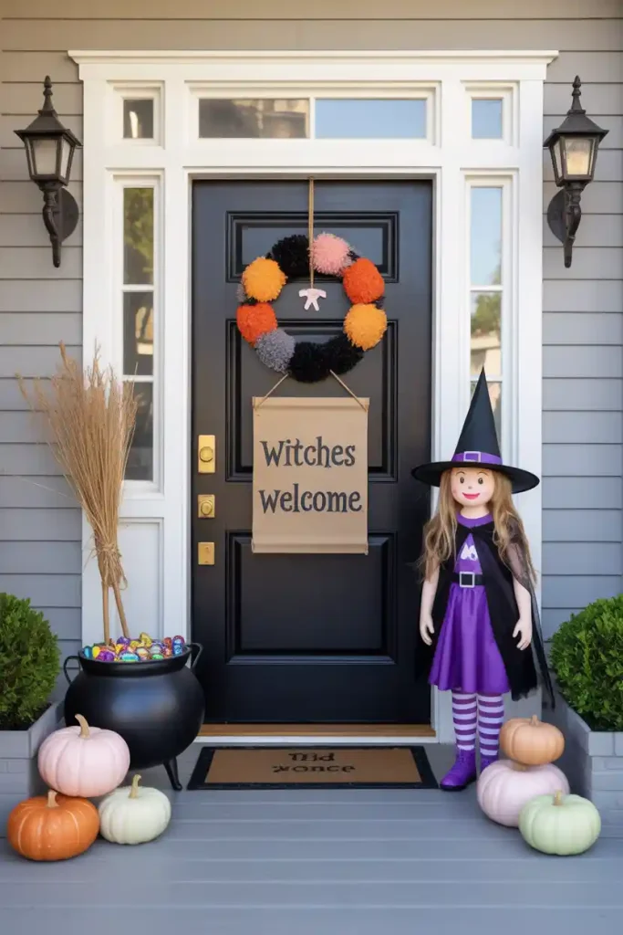 Not all witch-themed décor has to be scary. For a kid-friendly front porch Halloween decor idea, keep the witches whimsical instead of eerie. Use friendly witch figurines, candy-filled cauldrons, and pastel-colored pumpkins for a playful vibe.